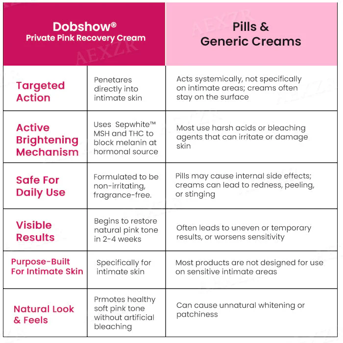 Dobshow® Private Pink Recovery Cream works by targeting the biological signaling pathways that regulate melanin production in the skin. Instead of merely exfoliating or bleaching the surface, the cream penetrates into the deeper layers of the epidermis where pigmentation begins. It acts on the communication between melanocytes (pigment-producing cells) and hormones that stimulate melanin synthesis—disrupting the signal that tells the skin to darken in specific areas.